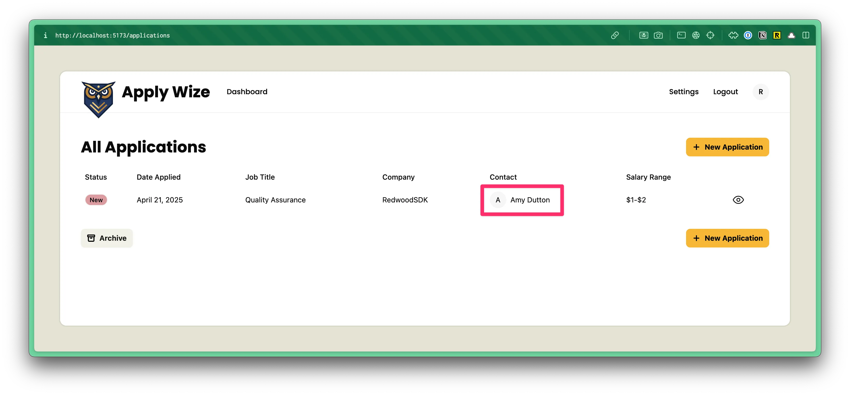 Now, when we add a job application, we need to associate the contact with the company. We’ll need to adjust our createApplication function within the src/app/pages/applications/functions.ts file slightly.