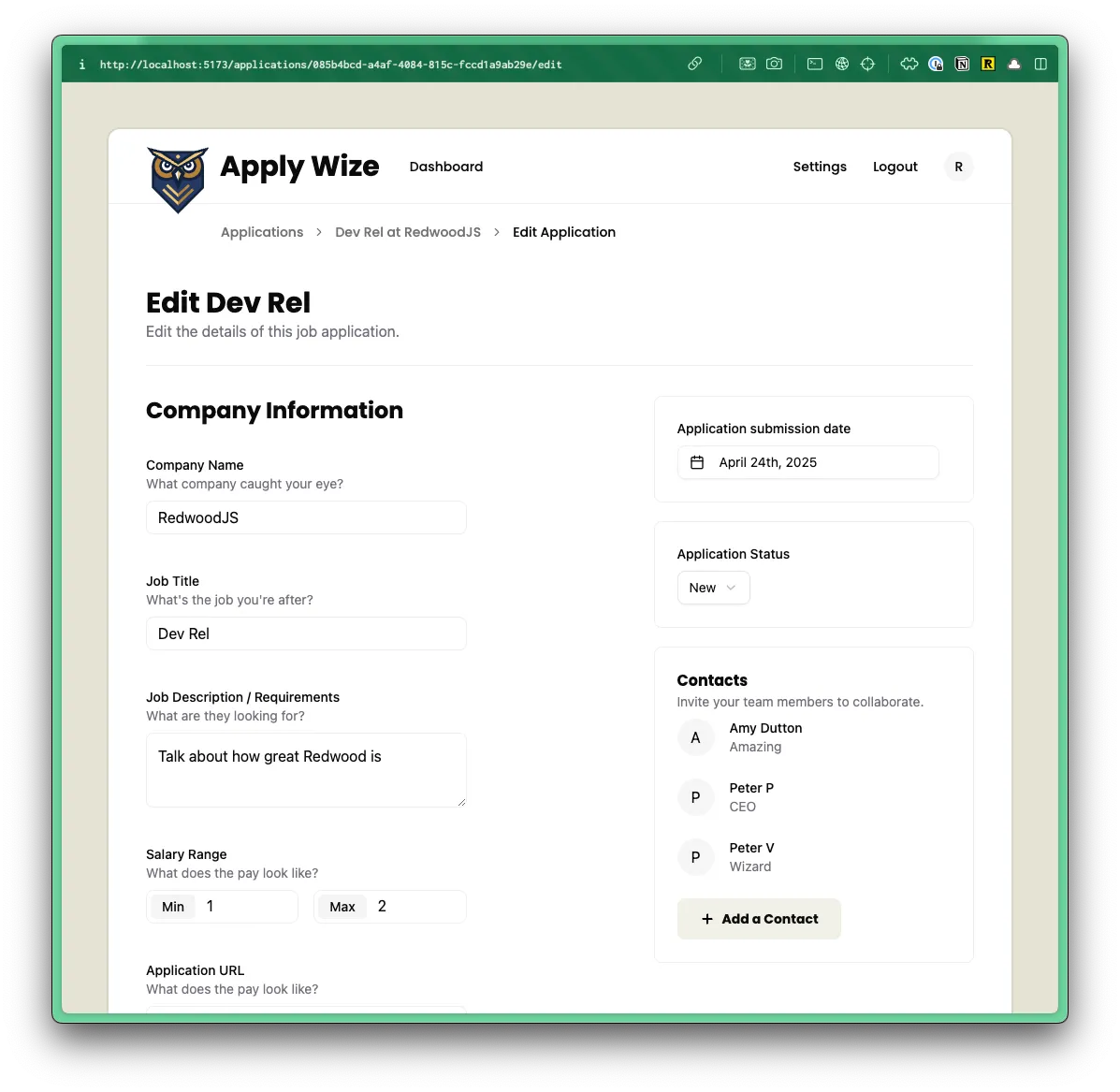 The URL for your page should look something like this: http://localhost:5173/applications/cc70d03f-6bf0-4a07-a46c-7f940be774b6