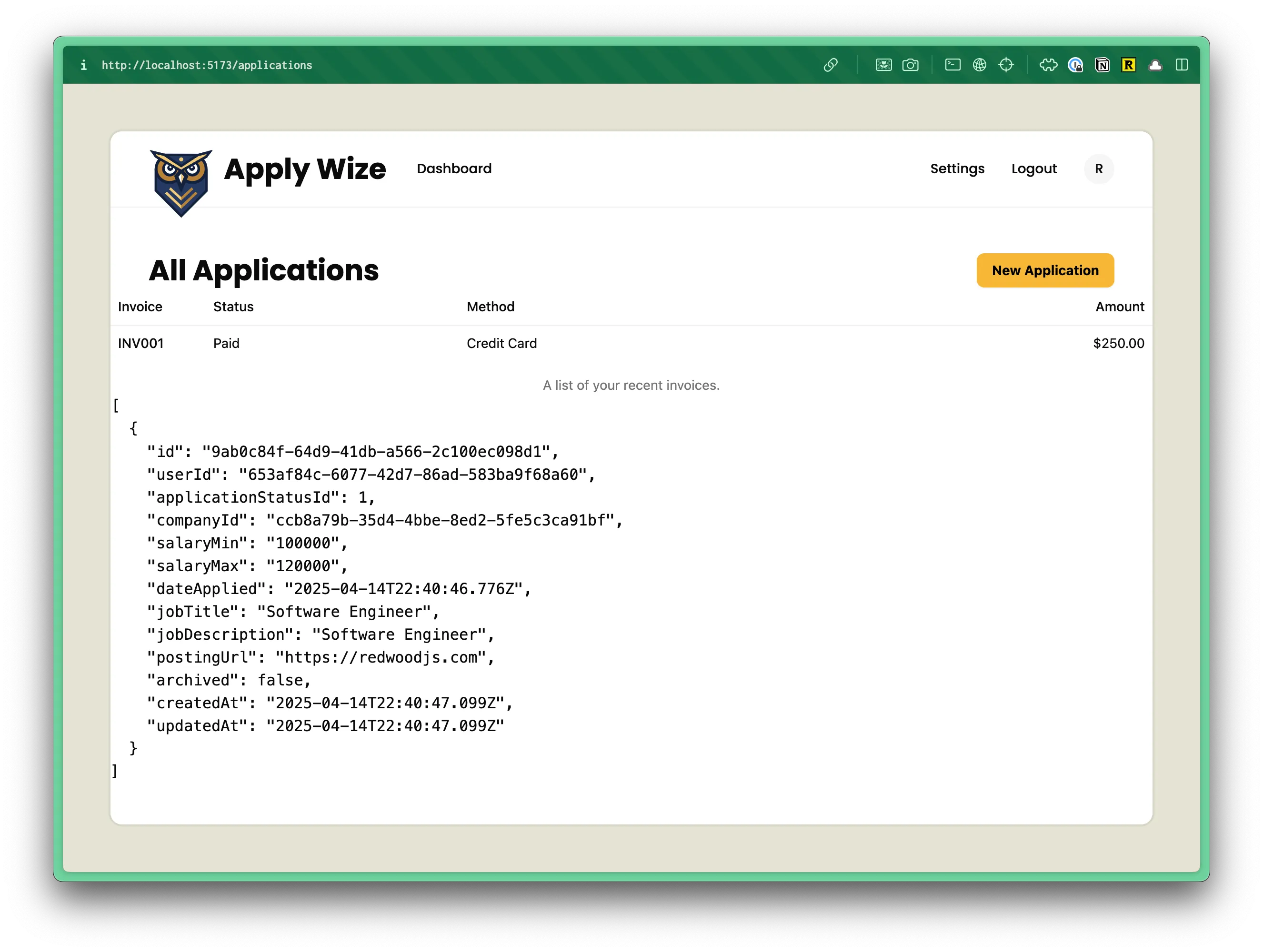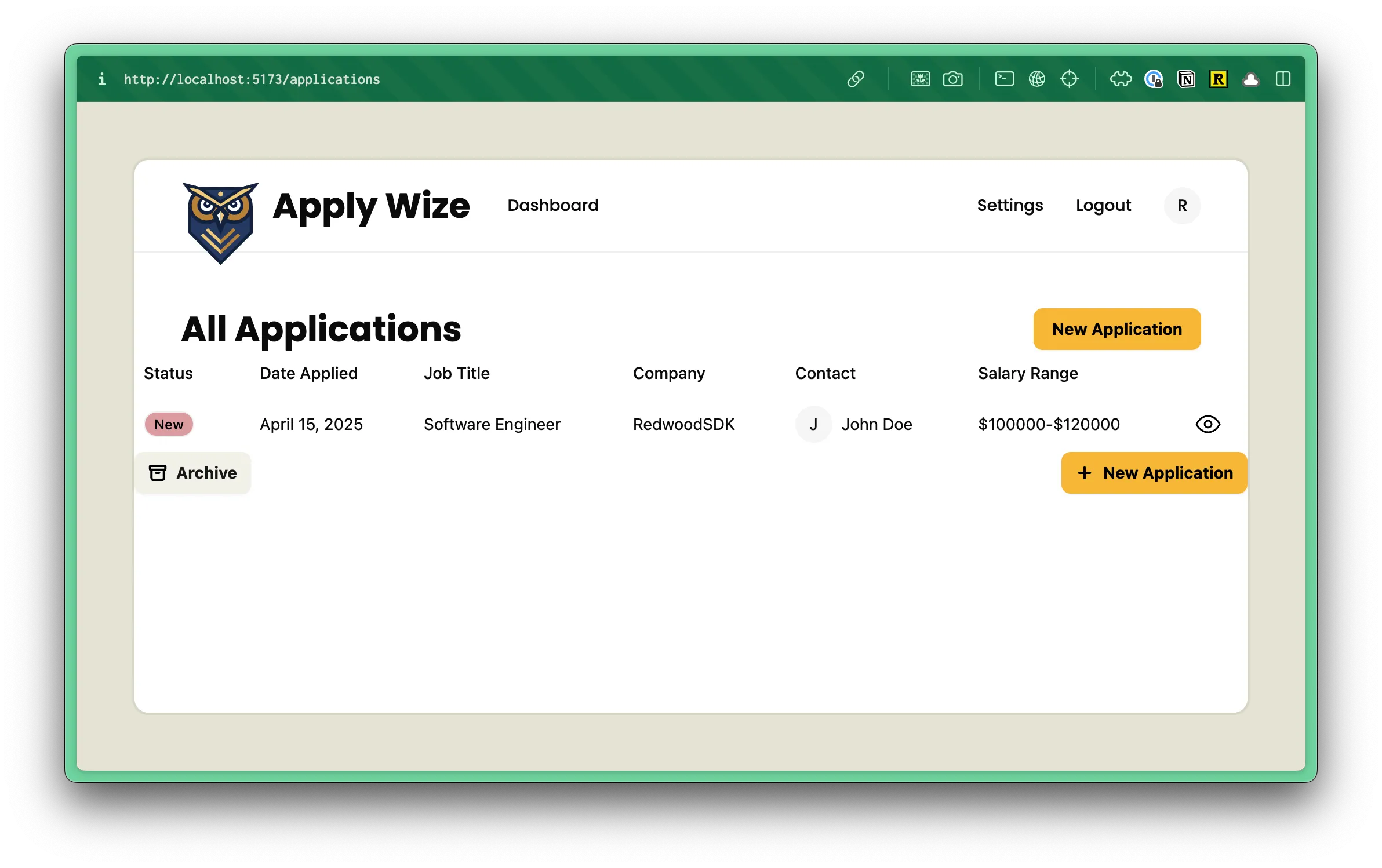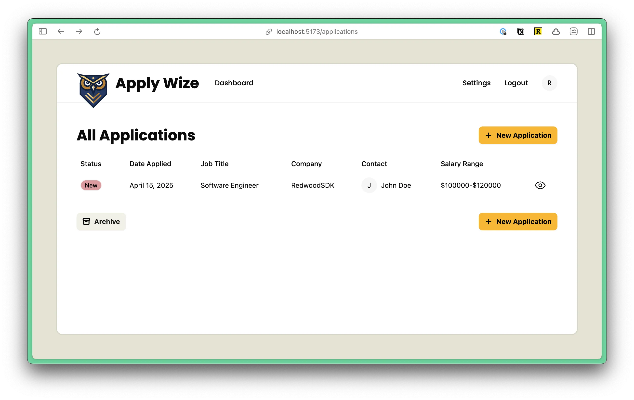 <pre>{JSON.stringify(applications, null, 2)}</pre>Below our table, let’s add a couple of buttons. An “Archive” button on the left and another “New Application” button on the right:
