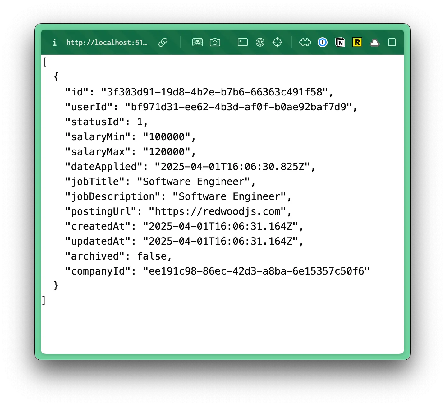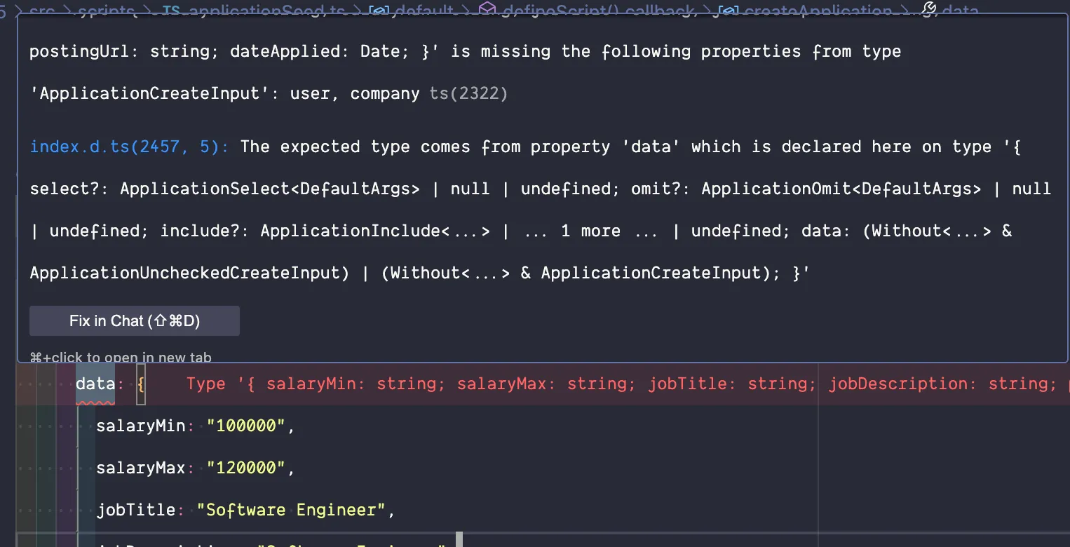 const createApplication = async () => { await db.application.create({ data: { salaryMin: "100000", salaryMax: "120000", jobTitle: "Software Engineer", jobDescription: "Software Engineer", postingUrl: "https://redwoodjs.com", dateApplied: new Date(), } })};