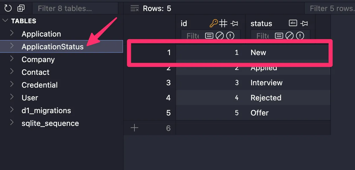 const createApplication = async () => { await db.application.create({ data: { user: { connect: { id: "0f9a097c-d7bc-4ab5-8b11-6942163df348", }, }, ...We want to do something similar for the status. If we look at the ApplicationStatus table, you’ll notice that an id of 1 is associated with a New application.