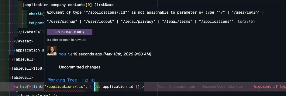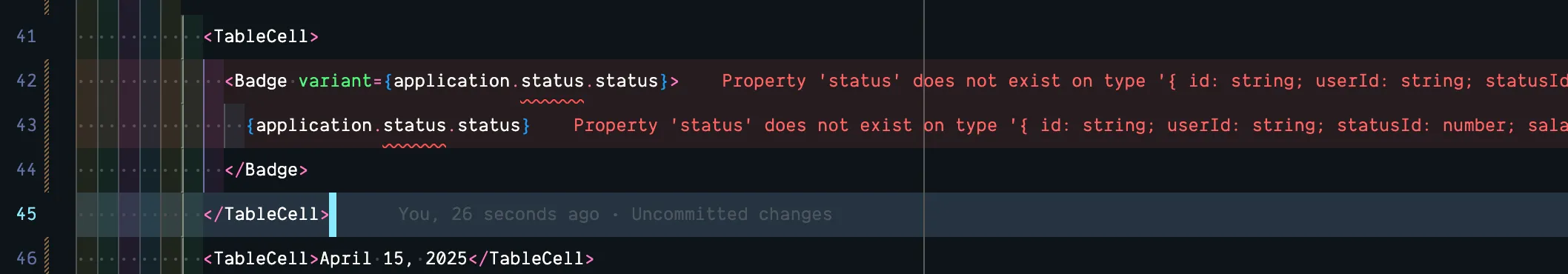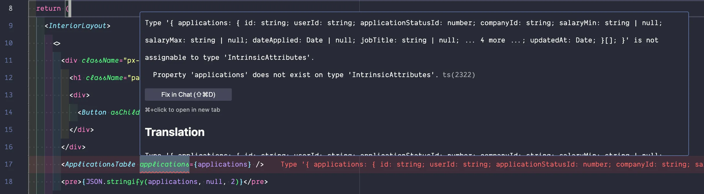 const ApplicationsTable = ({ applications,}: { applications: ApplicationWithRelations[];}) => {If you look at the TableCell with the status again, you’re probably still seeing an error 🤯