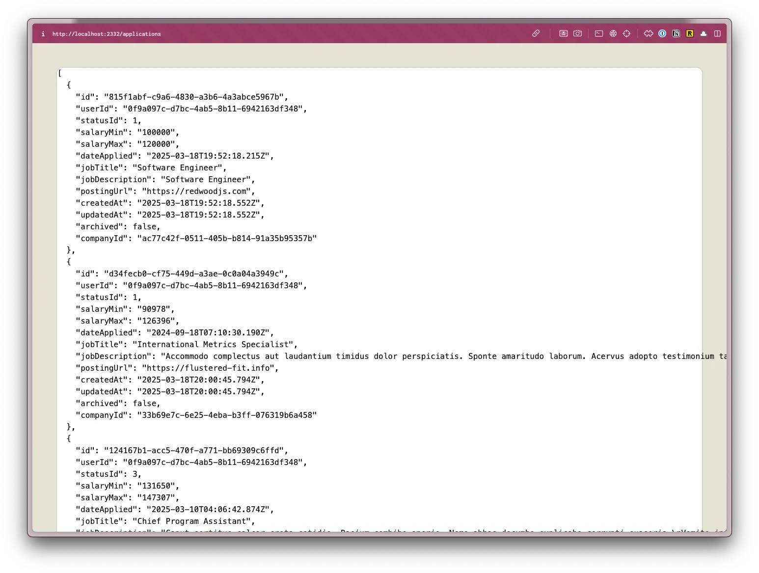 All the data from the database is returned as an array and saved in a variable called applications. Then, we can display all the data by using the JSON.stringify function. Wrapping our code in pre tags, it makes it easier to read.