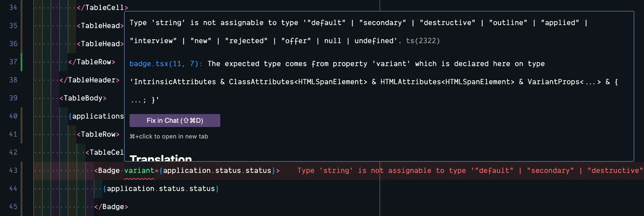<TableCell> <Badge variant={application.applicationStatus.status}> {application.applicationStatus.status} </Badge></TableCell>When we pass in the variant prop for our Badge component, it’s not just looking for a string, it’s looking for a specific string: "default" | "secondary" | "destructive" | "outline" | "applied" | "interview" | "new" | "rejected" | "offer" | null | undefined