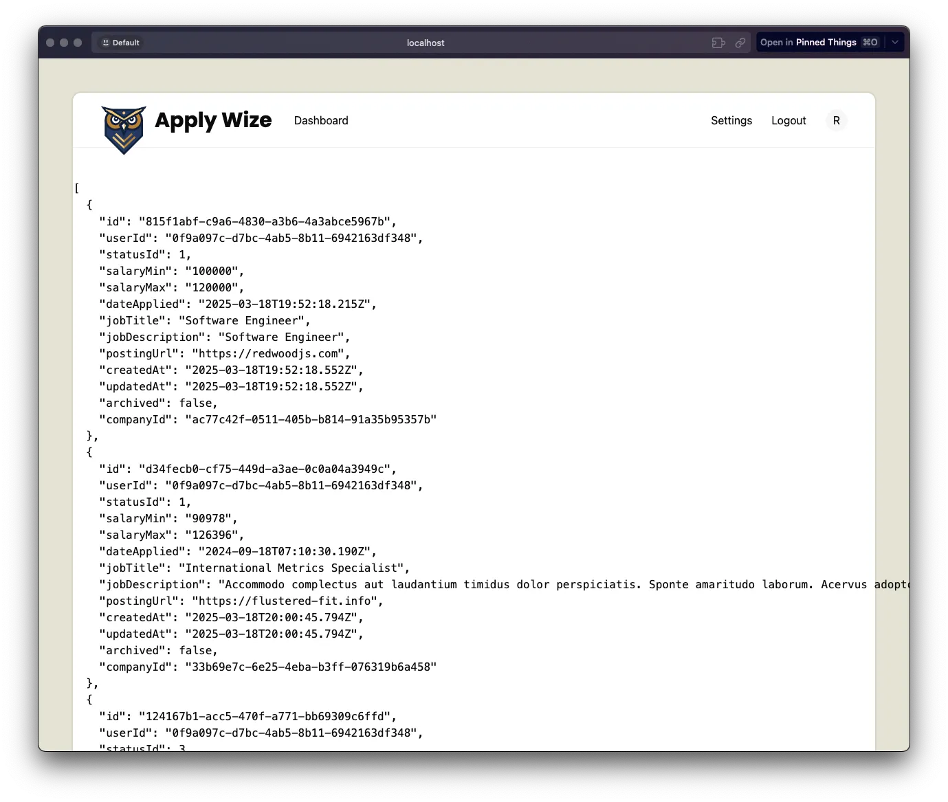 const createApplication = async () => { await db.application.create({ data: { ... company: { create: { name: "RedwoodSDK", contacts: { create: { firstName: "John", lastName: "Doe", email: "john.doe@example.com", role: "Hiring Manager", }, }, }, }, ...This time instead of using an object with a connect key, we’ll use a create key inside. Then, we can list an object with all the company’s data.