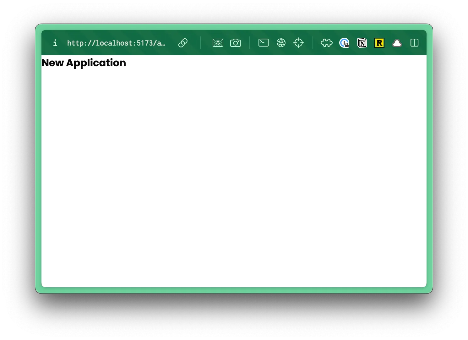 "/", "/user/login", "/user/signup", "/user/logout", "/legal/privacy", "/legal/terms", "/applications", "/applications/new", "/applications/:id",]);If we test this out within the browser, clicking on the “New Application” button at the bottom, you should see our temporary “New Application” page: