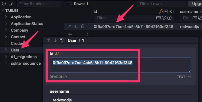 Let’s start with the user connection. If you look at the user table, you’ll see that their ID is 0f9a097c-d7bc-4ab5-8b11-6942163df348. (Obviously, yours will be slightly different.) Copy that value.